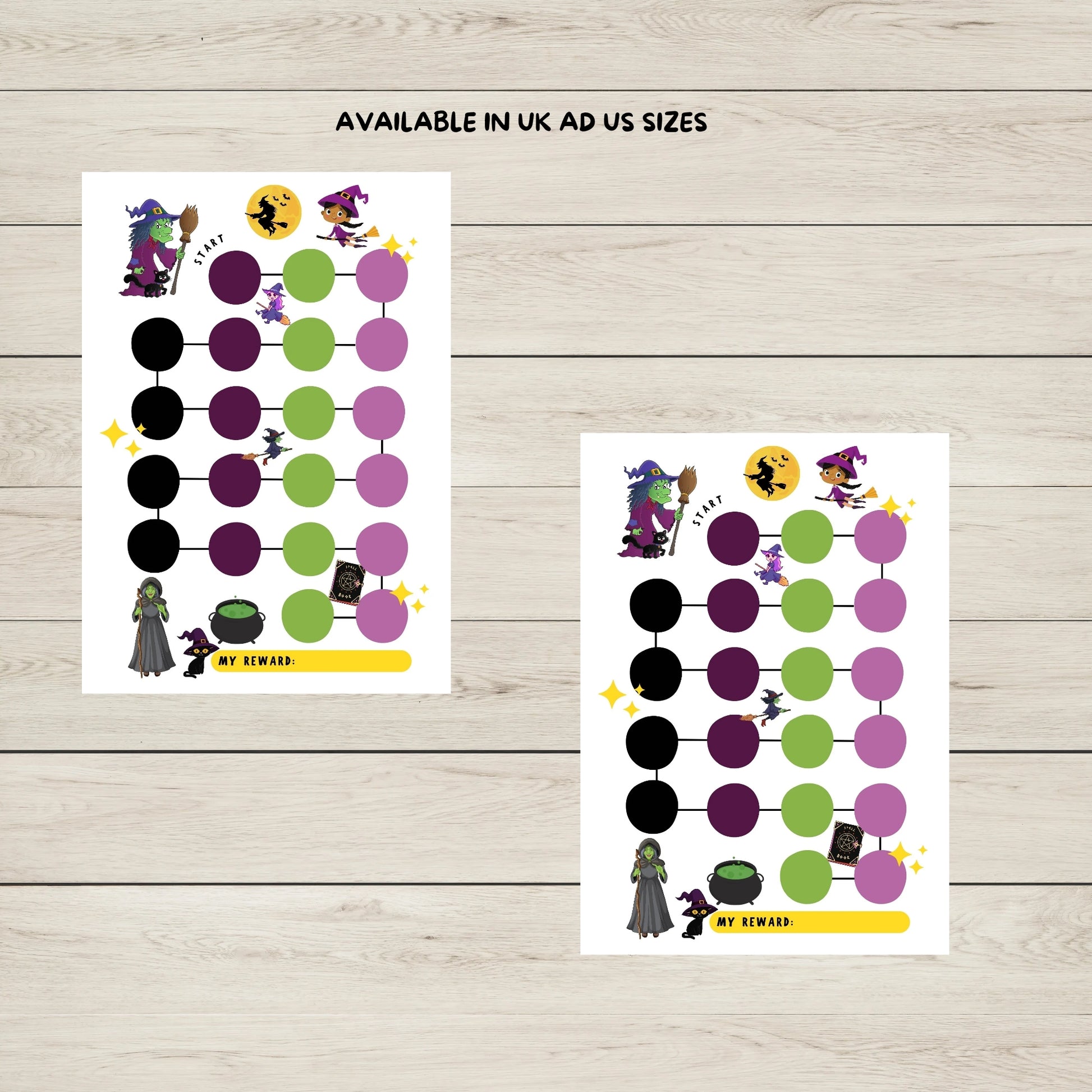 Perfect for Halloween season or year-round use, this witch-themed reward chart motivates children to earn stars, stickers, or check marks by completing positive behaviours.